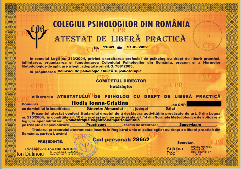 2022: Atestat de liberă practică în specializarea: psihoterapie cognitiv-comportamentală și începerea supervizării în această specializare. Cod RUP: 28662.